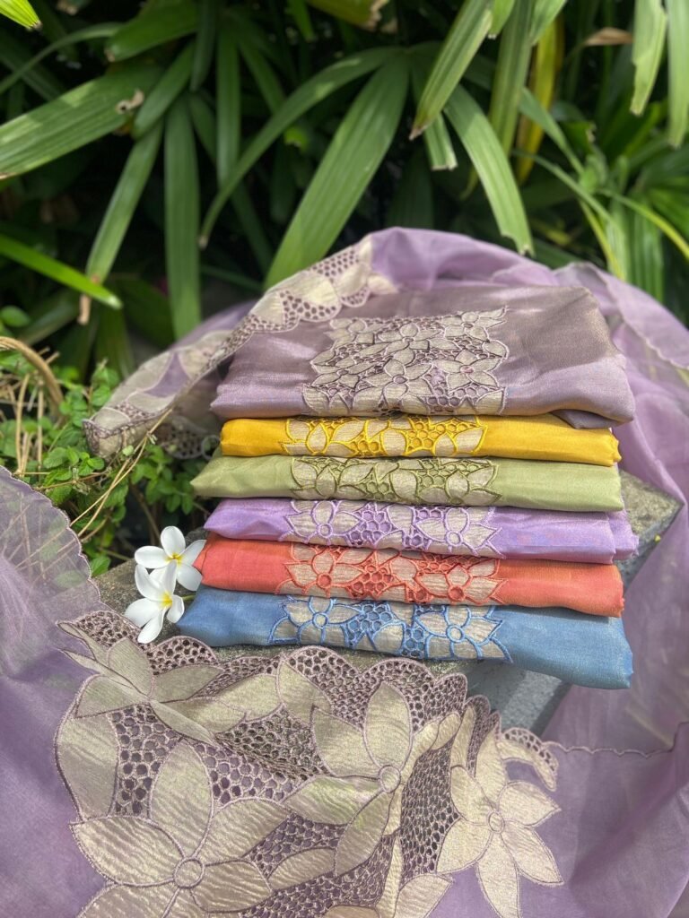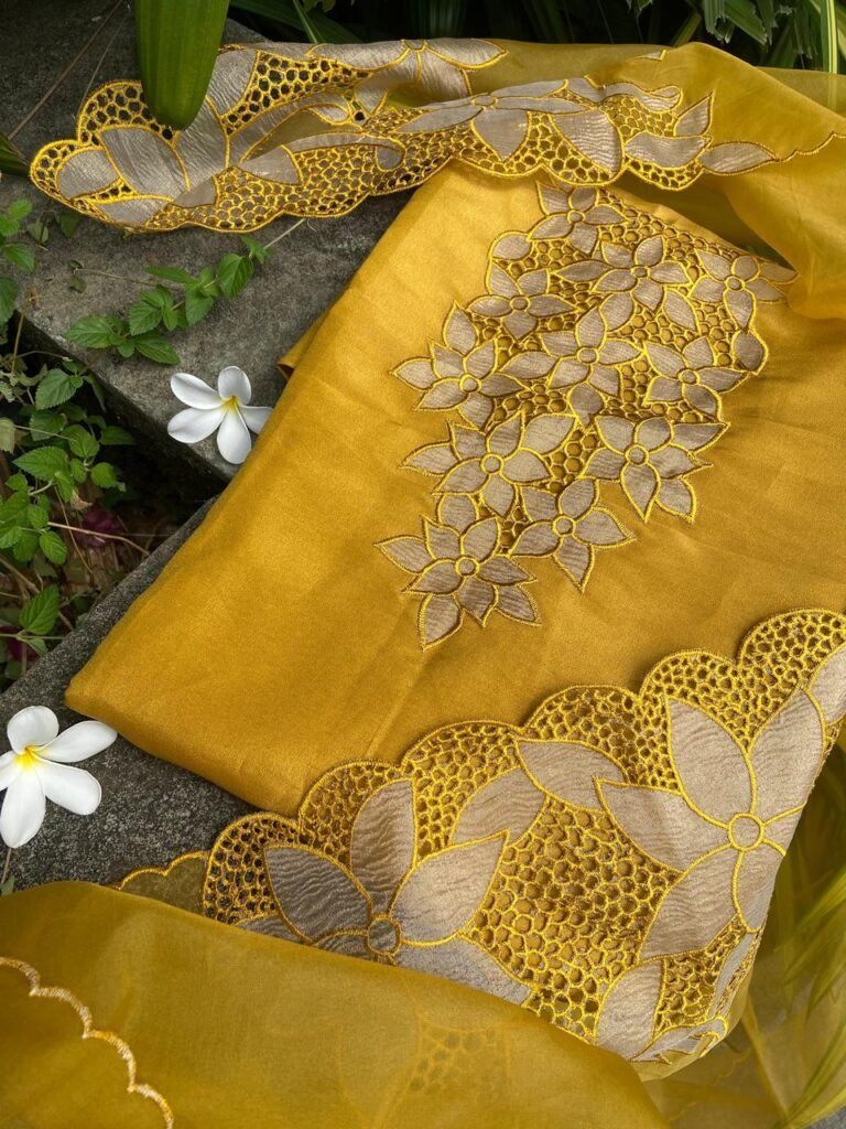 Presenting out Brand New Collection for Onam at a Special Price of ā¹1499/- curated on Chiffon woth Cutwork and beautiful floral embroidery! Ethereal hues of Pink, Pearl Green, Ivory gold, Dusty pink & Jet black on Chiffon top and Duppatta with floral embroidery & Cutwork. The floral embroidery design is created to resemble pearl embroidery. Bottom is cotton silk