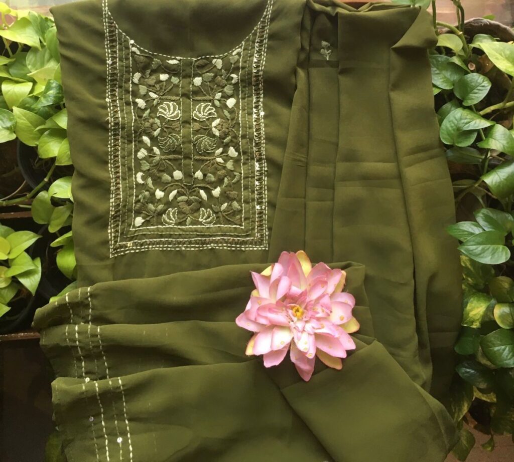 A beautiful Designer Wear Collection in Georgette with gorgeous Chikankari embroidery featuring a contemporary Paisley motif on top & Duppatta & tiny scalloped borders for detailing. Cotton silk bottom.